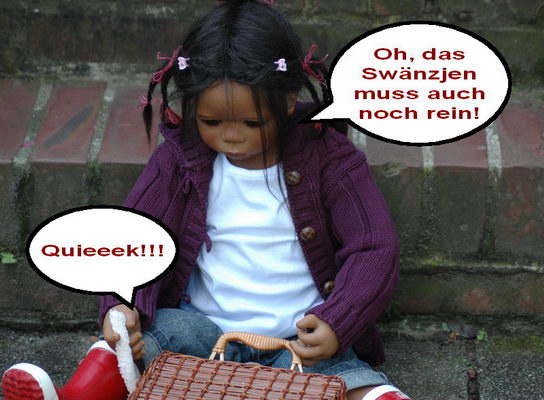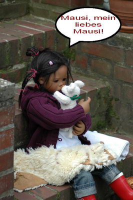 | Mama wollte ohnehin gerade noch die Waschmaschine einschalten. Also kommt Mausi kurzerhand mit dazu! Leleti macht sich allerdings große Sorgen, ob Mausi die Prozedur auch unbeschadet überstehen wird. | Nach einer - wie Leleti findet - unendlich langen Wartezeit, nämlich einem Waschmaschinen- und einem Trocknerdurchlauf, ist Mausi wieder wie neu und Leleti ist selig darüber, ihre kleine Freundin wieder unbeschadet zurück zu haben. |