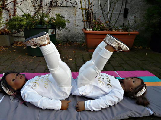 die Fußspitzen zeigen nach außen, Bauch einziehen, Rücken lang, Po rein, Fersen berühren sich ...