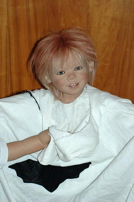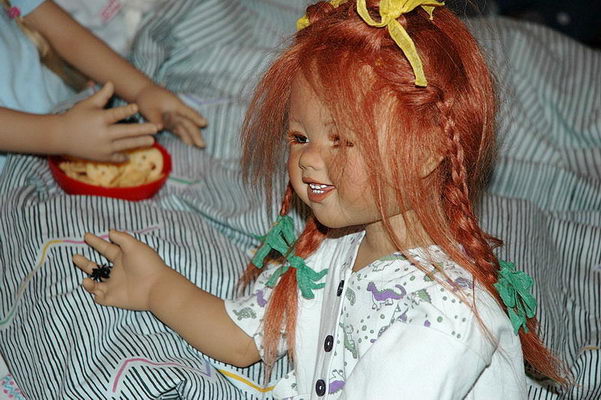 Sanrike hopst aus dem Bett, läuft mit schnellen Schritten auf das Gespenst zu und grapscht nach dem Umhang des Gespenstes. “Meine Mama sagt, es gibt keine Gespenster!” ruft sie laut. “Tu es nicht!” schreit Anna Lu.